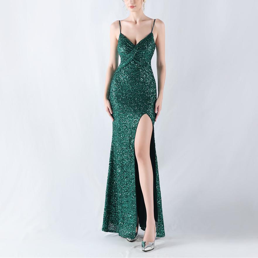 Shimmering Pleated Sequin Evening Dress with Delicate Spaghetti Straps-Emerald